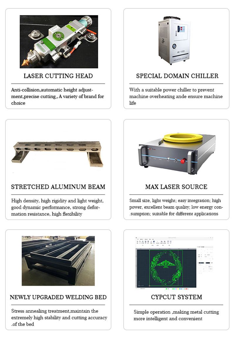 В станке для волоконной лазерной резки 3015 используются импортные оригинальные серводвигатели, редукторы, направляющие и т. д. Используется оригинальная импортная режущая головка в сочетании с высокоскоростными и высокоточными принадлежностями для обеспечения качества резки. Высокоточное шлифование зубчатых колес, импортные направляющие, импортные режущие головки и т. д. прошли строгий процесс сборки, чтобы обеспечить скорость и точность станка. Лазер может быть выбран в соответствии с потребностями клиента.