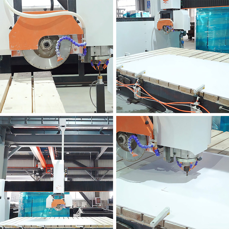5+1 Five Axis Bridge Stone Cutting Saw is used for cutting and engraving Marble, artificial stone, rock plate. The head can turn 360 degrees. The Platform can be lift up 85 degree, more easy for loading stone plate. Spindle motor 24,000 rpm speed, can drilling square holes, round holes and other shapes. This saw can cut by 45 degrees, cross cut, any shapes cut. With the suction moving plate, you can moving large plate easily and also do multi size processing.